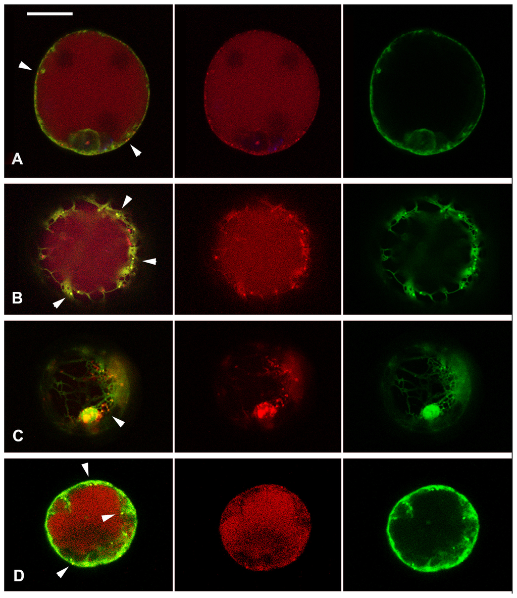 Tomato hypocotyl protoplasts transiently co-transformed with GFPChi (in green colour) and AleuRFP (in red colour). (A) Cell in control conditions, GFPChi is restricted to the ER and only AleuRFP labels small punctate structures (white arrows); (B) Cell treated with Auxin, it induces concentration of GFPChi in small punctate structures that colocalized partially with those labeled by AleuRFP (white arrows); (C) Cell treated with ACh, it caused accumulation of GFPChi in small vacuoles surrounded by several AleuRFP labeled structures (white arrow); (D) Cell treated with the two chemical combined, the treatment appeared very stressful but again it was evident that GFPChi and AleuRFP colocalized in punctate structures (white arrows); and (E) Cell treated with BFA induced bodies where GFPChi and AleuRFP colocalized partially (white arrows) but colocalization was not observed in the small discrete compartments exclusively labeled by AleuRFP. Scale bar: 20 μm.