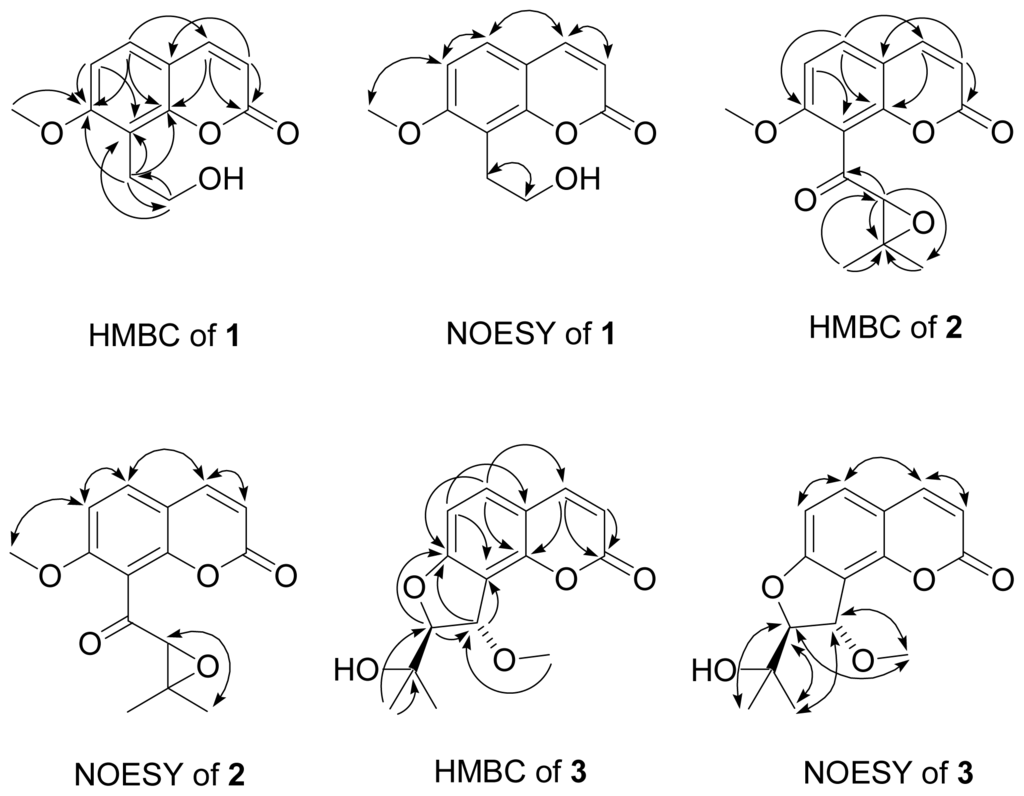 Compound 2 was obtained as a yellow oil, and the high resolution electron impact mass spectrometry (HR-EI-MS) data determined the molecular formula to be C15H14O5 (m/z 274.0834 ([M]+, calcd 274.0841)), indicating nine degrees of unsaturation. The IR spectrum indicated the presence of two carbonyl (1732 and 1716 cm−1), and aromatic (3061, 1600 and 1507 cm−1) functionalities. The 1H- and 13C-NMR spectra of 2 (Table 1) revealed resonances for a methoxy [δH 3.92 (3H, s); δC 56.6 (q)], a (Z)-configured conjugated double bond of a six-membered ring [δH 6.27 (1H, d, J = 9.6 Hz), 7.62 (1H, d, J = 9.6 Hz); δC 113.4 (d), 142.8 (d)], two ortho-coupled aromatic protons [δH 7.51 (1H, d, J = 8.8 Hz), 6.89 (1H, d, J = 8.8 Hz); δC 130.9 (d), 104.3 (d)], a conjugated ketone carbonyl [δC 195.2 (s)], an oxymethine [δH 3.83 (1H, s); δC 66.8 (d)], and a quaternary oxygenated carbon [δC 63.7 (s)] linked with two methyls [δH 1.45, 1.52 (each 3H, s); δC 18.5 (q), 24.8 (q)]. Altogether, 15 carbon signals were observed in the 13C-NMR spectrum of 2 and were assigned by DEPT (distortionless enhancement by polarization transfer) experiments as two alphatic methyl, four olefinic methine, four quaternary olefinic, one tertiary oxygenated, one quaternary oxygenated, two carbonyl, and one methoxy carbons. By comparison of the 1H- and 13C-NMR data with those of 1, indicated that both compounds exhibited identical structure in coumarin skeleton, the obvious differences occur in the signals of side chain at C-8. The NMR signals of hydroxyethyl group at C-8 were absent in 1, replaced by that of a side chain composed of five carbons including a conjugated ketone carbonyl [δC 195.2 (s)], an oxymethine [δH 3.83 (1H, s); δC 66.8 (d)], and a quaternary oxygenated carbon [δC 63.7 (s)] linked with two methyls [δH 1.45, 1.52 (each 3H, s); δC 18.5 (q), 24.8 (q)]. The structure of side chain was determined as 3-methyl-2,3-epoxy-1-oxobutyryl moiety by HMBC correlations as follows: H-2′ (δH 3.83)/C-1′ (δC 195.2), C-3′ (δC 63.7), C-4′ (δC 18.5), and C-5′ (δC 24.8) and H-4′ (δH 1.45)/C-2′ (δC 66.8) and C-3′ (Figure 2). Thus, compound 2 was accordingly determined to be 7-methoxy-8-(3-methyl-2,3-epoxy-3-oxobutyl)chromen-2-one.