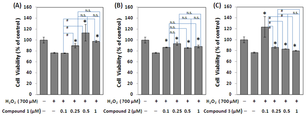 Protective effect from H2O2-induced oxidative stress on Neuro-2a neuroblastoma cells of (A) compound 1; (B) compound 2; and (C) compound 3. The cell viability is expressed as a percentage relative to control without H2O2 treatment. Values are mean ± SEM from three experiments. The asterisk symbol (*) indicates a statistically significant difference (p < 0.05) in relation to control with H2O2 treatment. The symbol (#) indicates a statistically significant difference (p < 0.05) between each experimental group. N.S. means not significant.