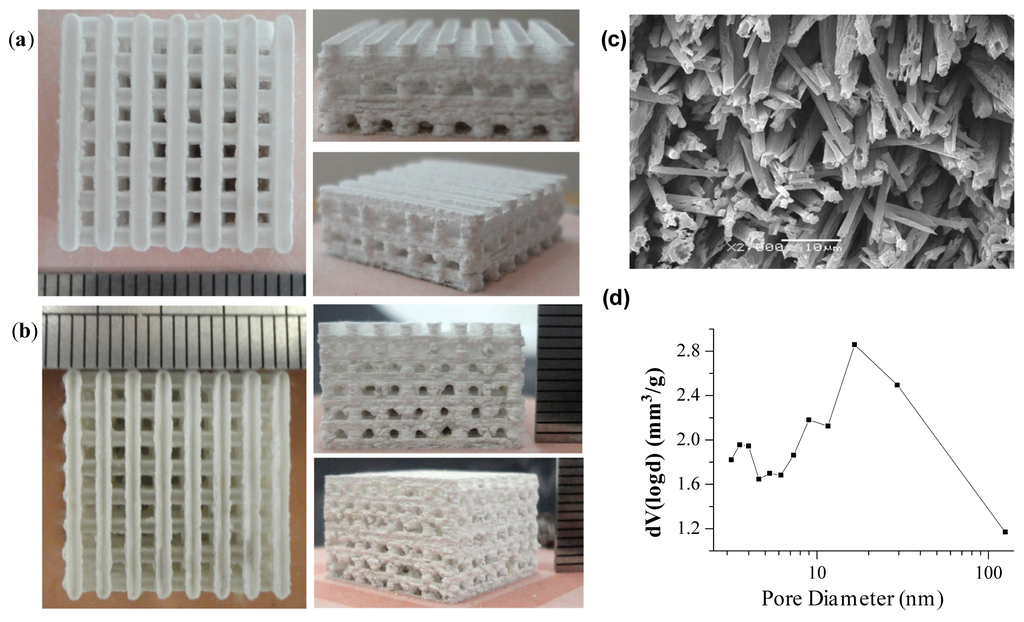 An ideal scaffold should be biocompatible, bioactive and biodegradable for osteogenesis, osteoinduction and osteoconduction. In addition, the scaffold should possess sufficient porosity to accommodate cell proliferation and differentiation. It is also desirable for scaffolds to have adequate mechanical property and appearance in accordance with the defect parts. Our research team developed a homemade selective laser sintering system in order to prepare nano-ceramic artificial bone with outstanding mechanical properties. The minimum spot diameter of laser can reach 50 μm with the focusing system. The SLS system could realize arbitrary complex movements based on the non-uniform rational B-Spline (NURBS) theory [106,107]. We have fabricated a variety of ceramic scaffolds using the system. It is able to prepare interconnecting porous structure (pore sizes: hundreds of micrometers) through adjustment of laser parameters and scanning space (Figure 1a,b). Multilayer stereo micro/nanometer-sized porous surface structures can be prepared by selective chemical etching of biphasic ceramic scaffolds in phosphoric acid solution (Figure 1c). The nitrogen adsorption data indicated hierarchical pore size distribution at 3–5 and 10–100 nm, as well as pore size above 100 nm on the scaffold surface (Figure 1d).