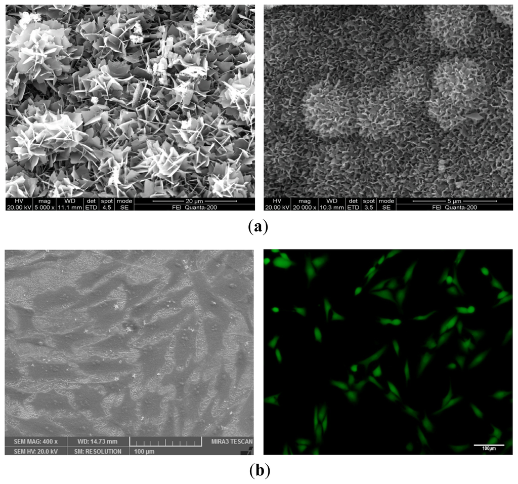 Figure 2. (a) Surface morphology of TCP ceramic scaffold after immersing in SBF; (b) MG-63 cells on TCP ceramic scaffold doped with 2.5 wt % ZnO.