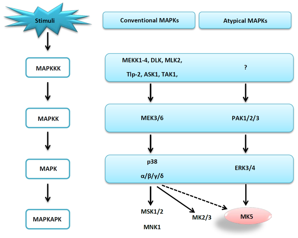 To date, seven distinct MAPKs pathways have been discovered in mammalian cells, and the MAPKs are divided into conventional and atypical MAPKs. The conventional MAPKs constitute three consecutive phosphorylation events mediated by three Ser/Thr protein kinases. This three-tiered cascade consists of: (1) MAPKs; (2) MAPK kinases that phosphorylate and activate MAPKs; and (3) MAPK kinases kinases that phosphorylate and activate MAPK kinases. Conventional MAPKs include the extracellular signal-regulated kinases 1 and 2 (ERK1/2), p38 MAPKs (p38 α, β, γ, and δ), c-Jun terminal kinases 1-3 (JNK1-3) and the ERK5 []. Conventional MAPKs are characterized by a conserved Tyr-X-Tyr motif in the activation loop of the kinase domain. Atypical MAPKs lack this motif, and are not organized in the classical consecutive phosphorylation cascade of three Ser/Thr protein kinases. Atypical MAPKs comprise ERK3/4, ERK7/8 and the Nemo-like kinases (NLK) [].