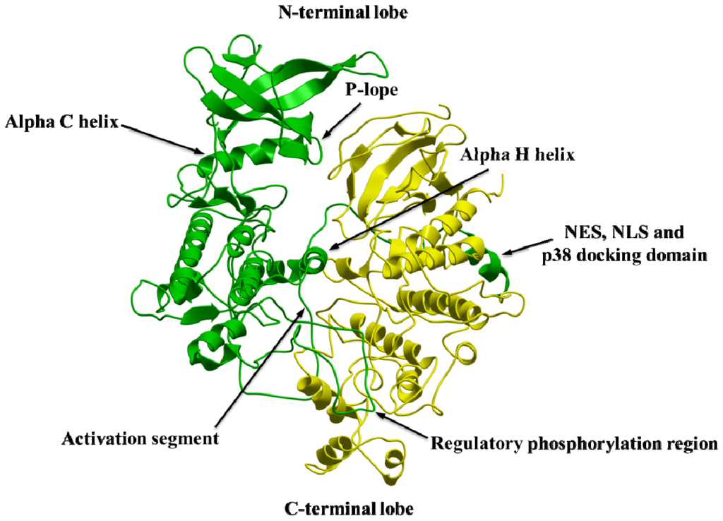 Mammalian mitogen-activated protein kinases (MAPKs) are cytoplasmic protein-Ser/Thr kinases that participate in signal transduction by catalysing the transfer of the γ-phosphoryl group from ATP to a hydroxyl group of the protein substrate. All mammalian cells possess multiple MAPKs involved in controlling cellular processes such as proliferation, differentiation, survival, apoptosis, gene regulation and motility [].