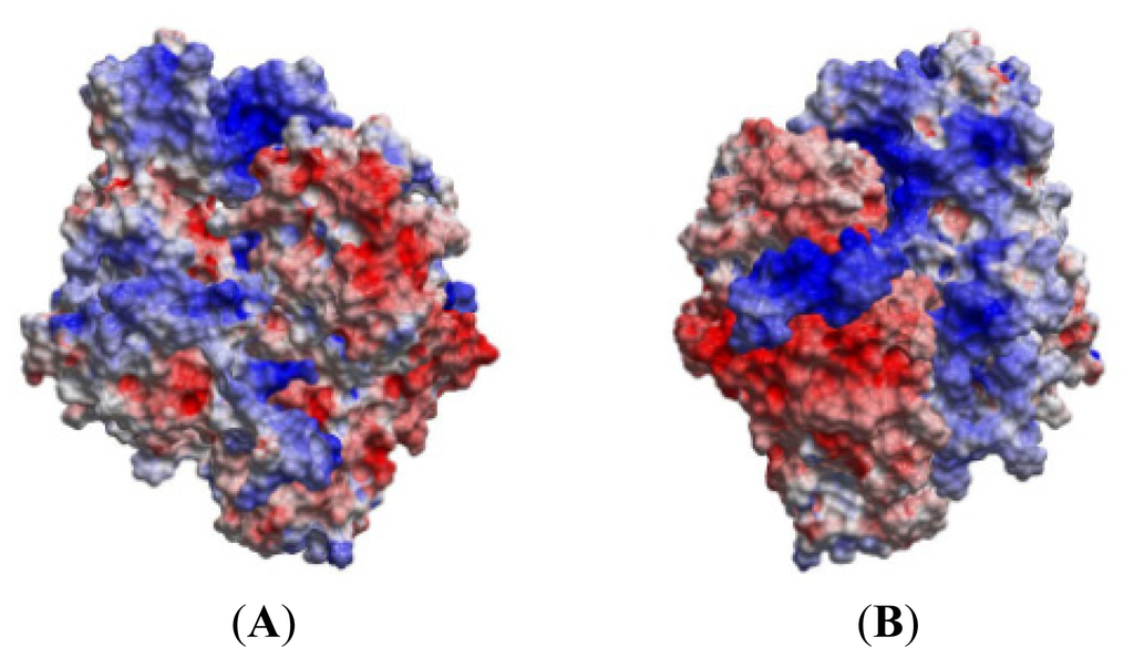 Calculations of the Electrostatic Potential Surfaces (EPS) indicated that the C-terminal segment with the p38 docking site and the regulatory phosphorylation region of MK5 are strongly electropositive and the other regions of MK5 facing p38α are mainly electropositive (Figure 11). However, the ATP binding pocket of MK5 located between the N-lobe and C-lobe is electronegative (Figure 11C). The regions of MK5 facing the solvent are partially electronegative and partially electropositive. p38α has a solvent-exposed side that is mainly electronegative, while the side facing MK5 is mixed electronegative and electropositive with highly electronegative areas in the regions interacting with MK5, the P-loop, helix αH, regulatory phosphorylation site, and p38 docking domain (Figure 11). This observation indicates that the charge distribution on the surface of MK5 and p38α is important for orienting the kinases relative to each other for a proper binding and that the binding is initiated by electrostatic forces.