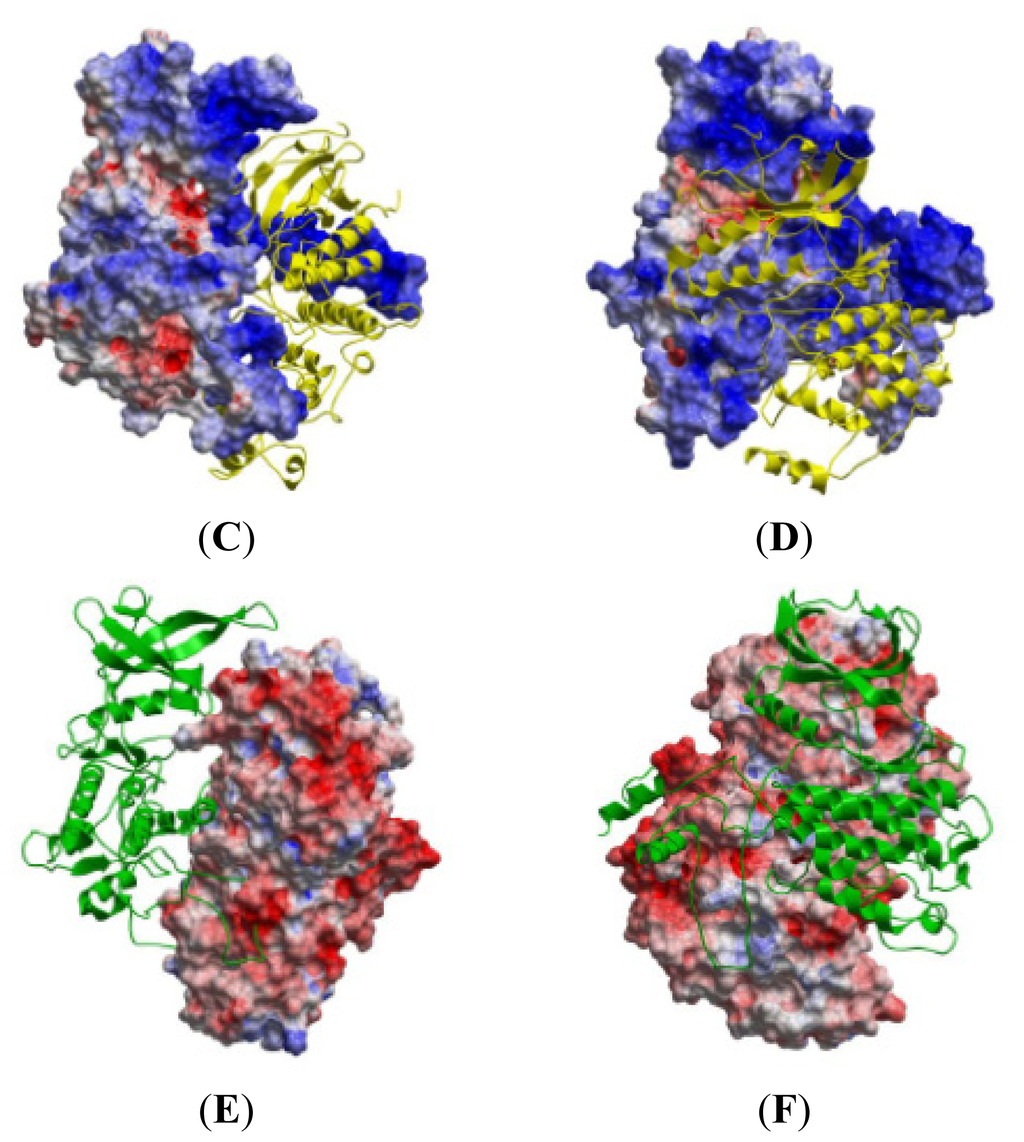 Skin representation of the molecular electrostatic potential surface (EPS) coloured according to the electrostatic potentials. Colour coding: red; ESP < −5 kcal/e.u. charge units, blue; >+5 kcal/e.u. charge units, grey: between −5 and +5 kcal/e.u. charge units. (A) Entire complex in the same view as in Figure 8; (B) Entire complex rotated 180 degrees (y-axis) compared with (A); (C) The EPS of MK5 with backbone Cα-trace of p38α in yellow. Same view as in (A); (D) Same as in c, but rotated 90 degrees (y-axis) compared with (C); (E) The EPS of p38α and the backbone Cα-trace of MK5 in green. The same view as in (A); (F) Same as in (E), but rotated 90 degrees (y-axis) compared with (E).