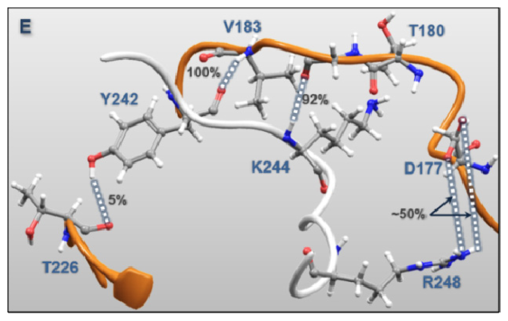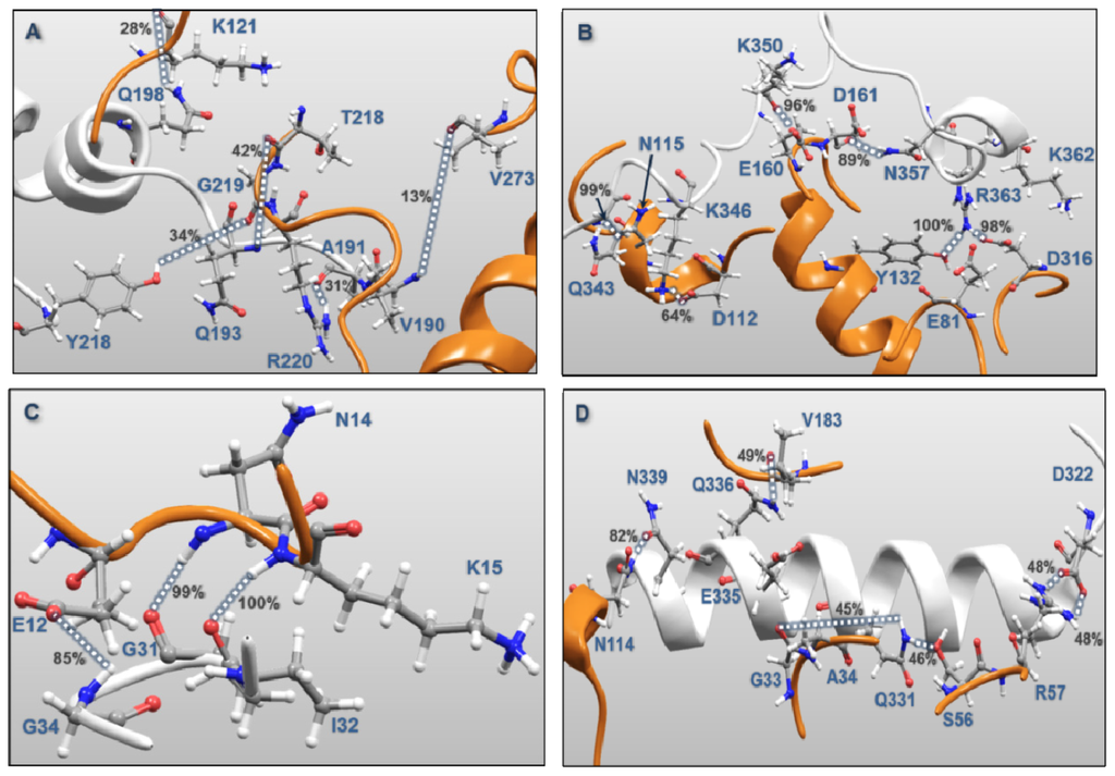 Interacting pair of amino acids forming at the MK5-p38α interface during 100 ns MD.