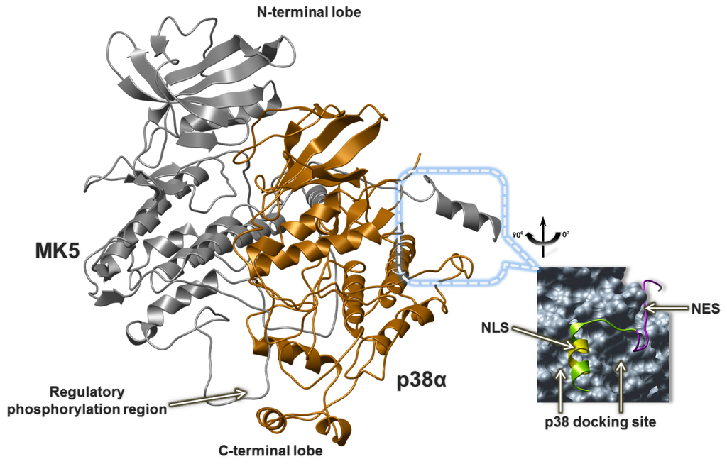 A close up of the nuclear export signals (NES) and nuclear localization signals (NLS) of MK5. The MK5-p38α complex indicates that NES and NLS are masked by the binding of p38α. MK5 in grey ribbon and p38α golden color ribbon.