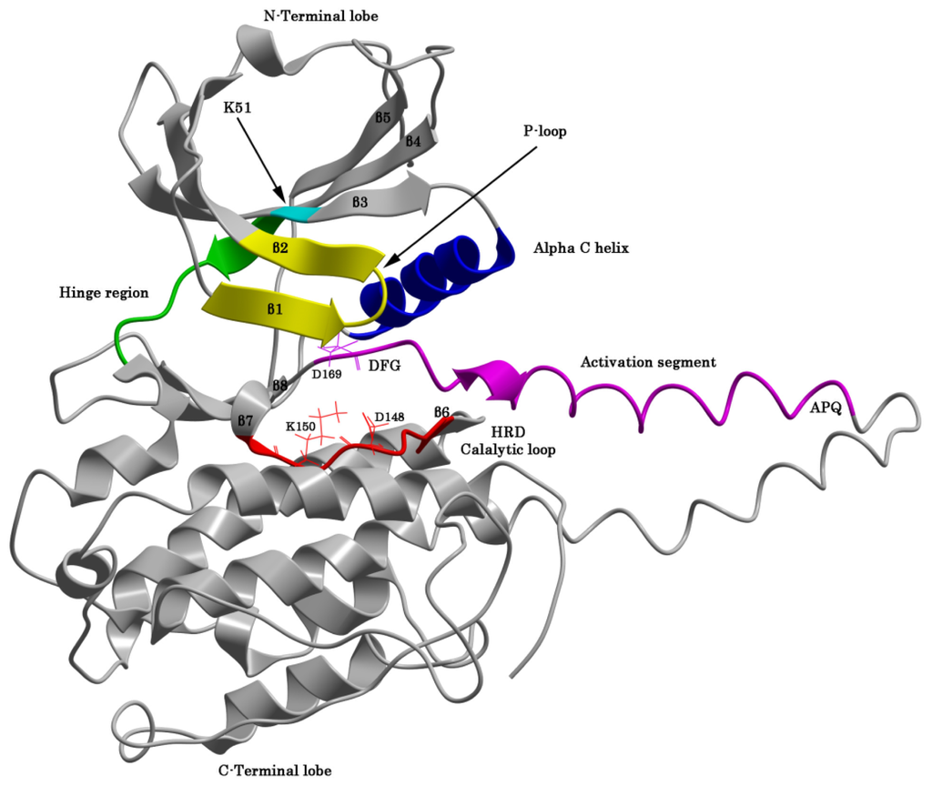 Three amino acids in ERK1 and ERK2 are defining a catalytically important K/D/D motif []. These amino acids are also conserved in MK5. In ERK1 and ERK2, the lysine of this motif resides in the β3 strand and corresponds to Lys51 in MK5. In addition to forming a salt bridge with the glutamic acid in αC in the activated state, the lysine also binds the α- and β-phosphorus atoms of ATP. The aspartic acids of the K/D/D motif are located in the C-terminal lobe as part of the catalytic loop and the activation segment, respectively (Figure 2). In MK5, the first aspartic acid of this conserved K/D/D motif is part of a HRDLK segment in the catalytic loop, located in the C-terminal of the β6-strand, and corresponding to His146-Arg147-Asp148-Leu149-Lys150-Pro151 in MK5. In both ERK1 and ERK2 this aspartic acid is suggested to position the substrate hydroxyl group, and extract the proton of the OH-group and facilitate a nucleophile attack of the substrate oxygen on the γ-phosphorus atom of ATP. The aspartic residue thereby functions as a base in the catalytic reaction []. The ERK1 and ERK2 structures also show that the lysine (corresponding to Lys150 in MK5) of this segment binds the oxygen of the substrate hydroxyl group and the γ-phosphorous atom of ATP. The second aspartic acid in the K/D/D motif of ERK1 and ERK2 is the first amino acid in the activation segment that begins with the DFG motif corresponding to Asp169-Phe170-Gly171 in MK5. The DFG motif is followed by the activation loop that contains the regulatory phosphorylation site (Thr182 in MK5). In an active protein kinase, the aspartic acid is pointing into the active site and interacts with two Mg2+ ions that interact with the α-, β- and δ phosphates of ATP. The activation loop is fundamental both for substrate binding and catalysis.