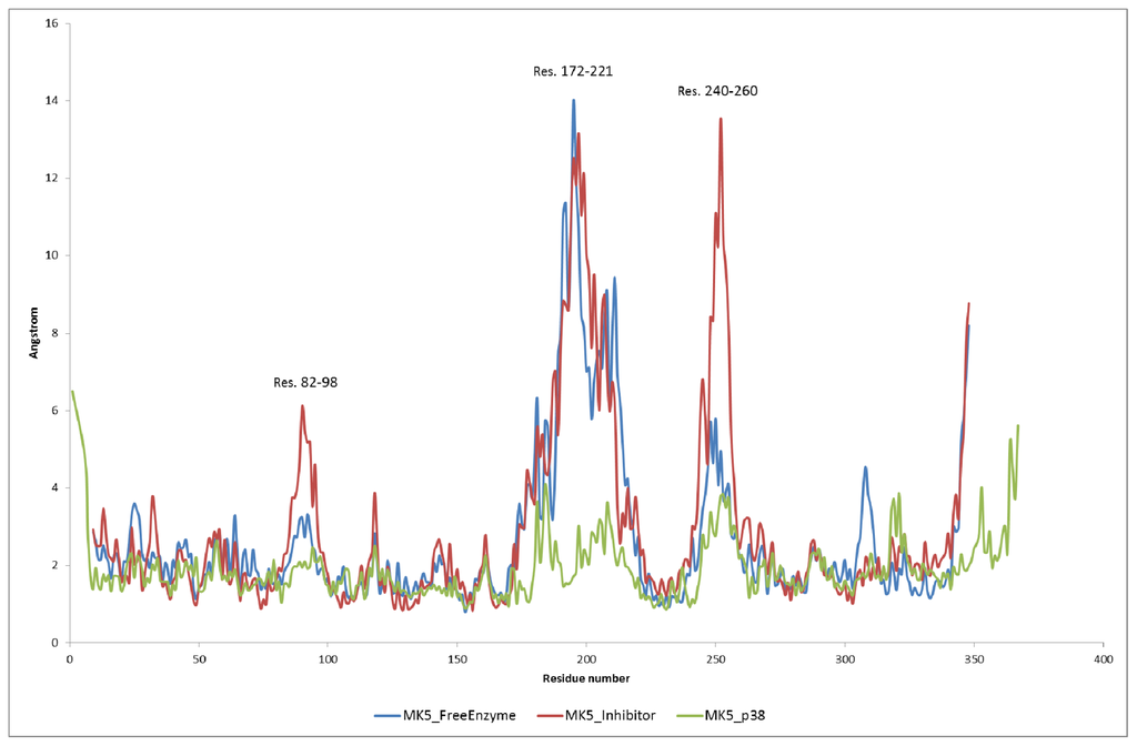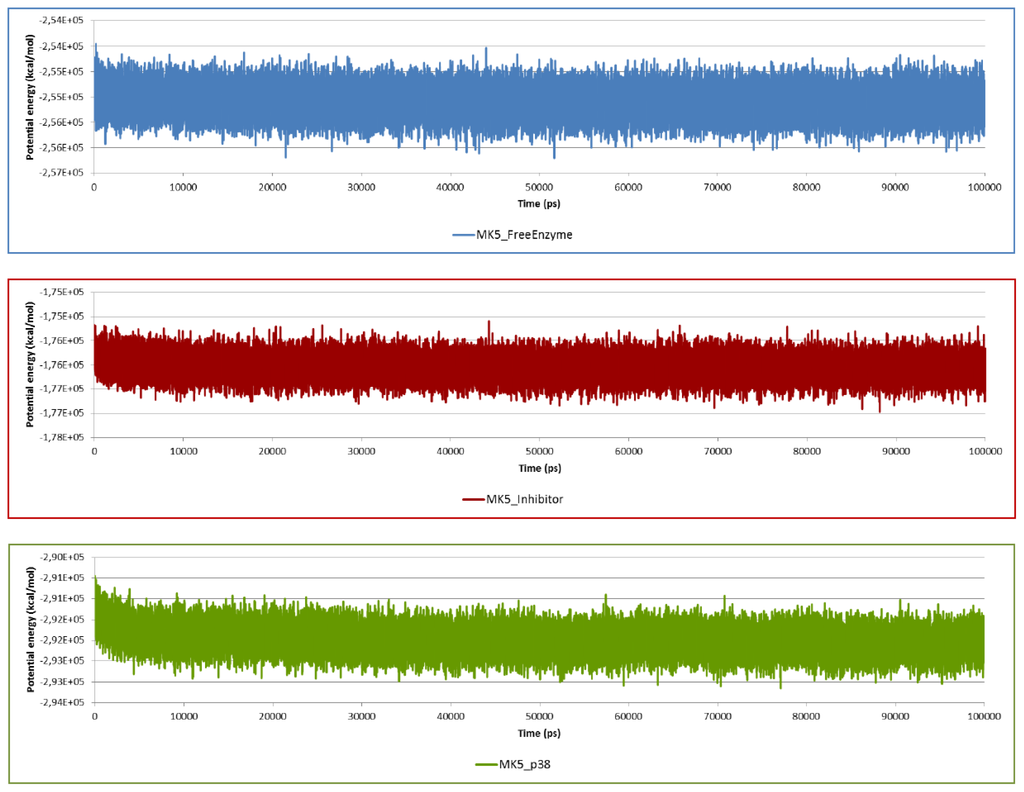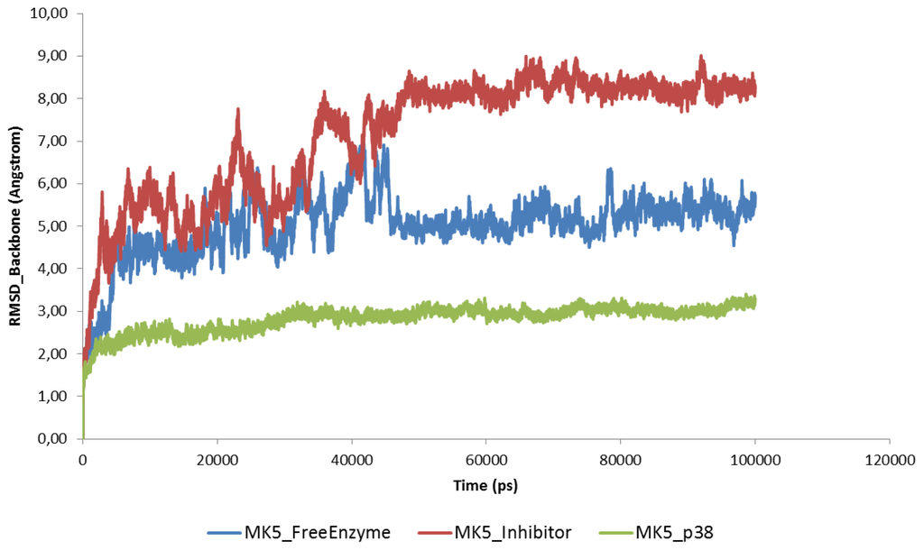 After using the default relaxation/equilibration protocol of the Desmond program, which includes series of steepest decent energy minimisations and short MD simulations at different temperatures (described in Section 3.3), the molecular systems were simulated for 100 ns. The plots of Root Mean Square Deviations (RMSD) (Figure 3), potential energy (Figure 4) and Root Mean Square Fluctuation (RMSF) (Figure 5) and atomic distance during 100 ns sampling simulations do not include the relaxation/equilibration period. The RMSD of backbone atoms of the MK5 models relative to initial structures show that stable molecular systems were obtained during MD. The RMSD plots indicated that the free MK5 model and the MK5-inhbitor complex were more unstable in the first part of the simulations than the MK5-p38α complex. The template for constructing the MK5 model that was used for MD of the free enzyme and the MK5-inhibitor complexes was a MK3-inhibitor complex (PDB id: 3FHR), and some structural reorganization may be necessary to account for the removal of the MK3 inhibitor during the modelling process. During 100 ns MD with the p38α complex the RMSD of the backbone stabilised at around 3 Å after approximately 30 ns of simulation. During 100 ns MD with the inhibitor, the complex stabilised at around 7.5 Å after about 45 ns, while the free MK5 model stabilised at around 5 Å after about 45 ns of MD (Figure 3). The trend for the 200 ns MD with the inhibitor was similar to the 100 ns MD (data not shown).