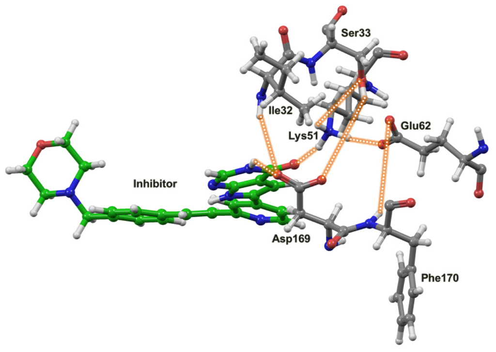 The MDs with MK5 alone and with the inhibitor were started from a MK5 conformation in which Lys51 in αC and Glu62 in β3 were in close proximity, which is consistent with an activated protein kinase conformation. This conformation was very stable during 100 ns MD of MK5 alone. During MD simulations with the inhibitor, the atomic distance between Lys51 and Glu62 was also very stable, but the inhibitor binding disrupted the hydrogen bonding network between other amino acids at the binding site and thereby influenced their molecular motions. The inhibitor binding pose was stable both during the 100 ns MD and the 200 ns MD. The pyrrolopyrimidine ring system interacted with a polar and charged region of MK5, including Lys51, while the pyridine ring interacted within a hydrophobic region. In addition, water molecules were forming hydrogen-bonding interactions with the inhibitor during MD (Figure 8). The simulations with the inhibitor indicated that the inhibitor binds to a MK5 conformation consistent with an active protein kinase and thereby functions as an inhibitor by occupying the ATP binding site. The inhibitor binding affects the hydrogen bonding network between active site amino acids, which then increases the atomic distance between Lys51 and Glu62 compared with a fully active protein kinase structure.