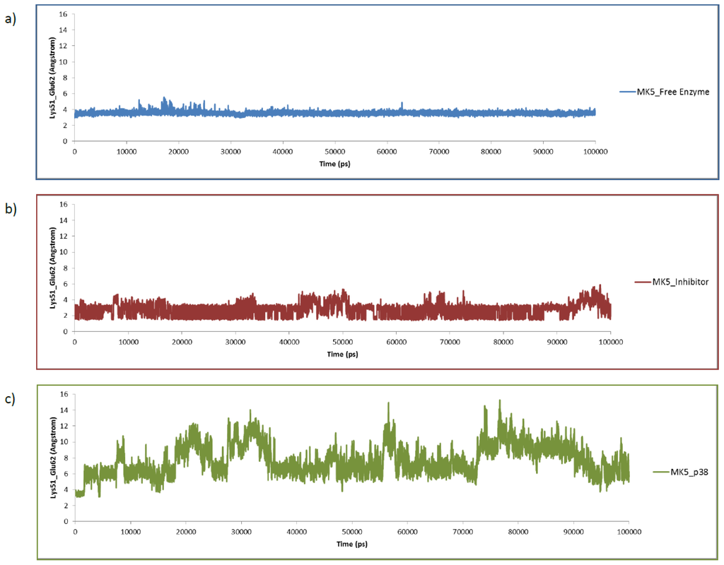 The atomic distances (Å) between Lys51 and Glu62 during 100 ns MD simulations. (a) free MK5; (b) inhibitor-MK5 complex; (c) p38α-MK5 complex.