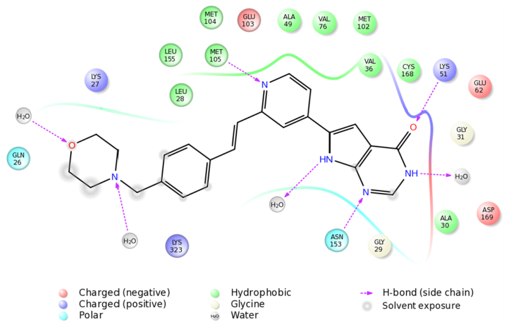 The 100 ns MD with the inhibitor indicated that a very stable MK5-inhbitor complex was formed and that the inhibitor was in a stable binding mode throughout the MD. During the 100 ns, the pyrimidine ring system interacted within a charged and polar part of the MK5 binding pocket, and the CO-group of the pyrimidine ring interacted with Lys51 in the αC helix (Figure 8). Up to 25 ns, the interacting distance was in the range of 4–6 Å, but from 25 ns, stable hydrogen bonding interactions (1.8–2.3 Å) were observed. The nitrogen atom of the pyrimidine ring interacted with Asn153, and from 25 ns to the end of the simulation the interacting distance was fluctuating between 1.7 to 4 Å. The pyridine ring interacted in a hydrophobic region of MK5 and the nitrogen interacted with Met105 in the hinge region. Up to 35 ns, the interacting distance was about 2Å, and after 35 ns up to the end of the MD the interacting distance was fluctuating between 2 and 5 Å. The morpholine ring and the phenyl ring interacted with amino acids in the C-terminal end of β1 (Gln26-Lys27-Leu28). However, water molecules also seem very important for binding the inhibitor (Figure 8). During MD, water molecules were forming hydrogen bonds with both the oxygen and the nitrogen atom of the morpholine ring, the NH-group of the pyrrolo ring and the NH-group of the pyrimidine ring (Figure 8).