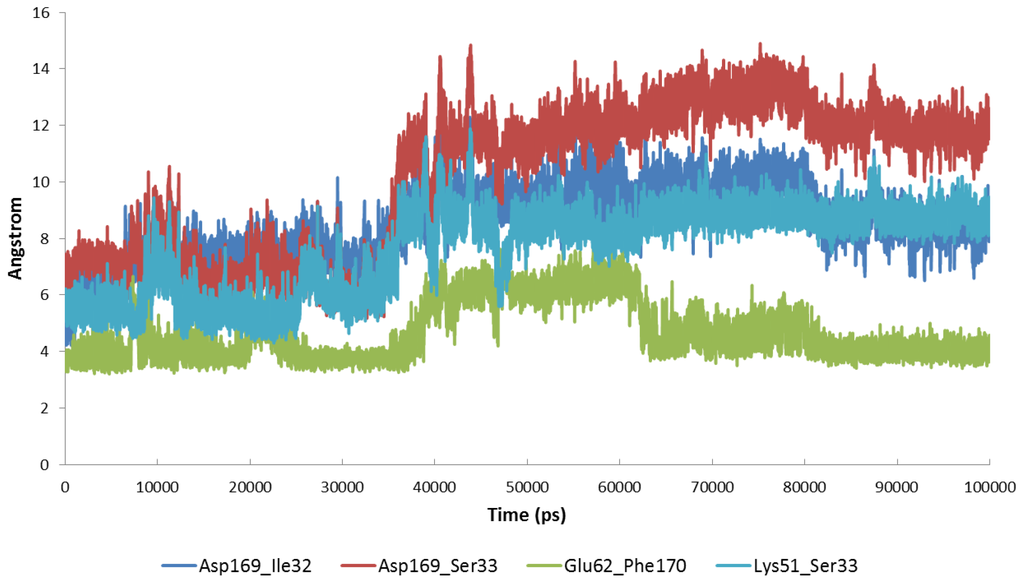 After optimization and equilibration the complex was simulated for 100 ns. The RMSF during MD (Figure 5) showed that the fluctuations of the flexible loops (including the P-loop) during MD were decreased compared with the simulations with MK5 alone and the inhibitor complexes. However, monitoring the atomic distance between Lys51 and Glu62 at the active site showed that this distance varied a great deal during the MD (Figure 7). A similar trend was also seen for the following atomic distances: Glu62-Phe170, Lys51-Ser33, Asp169-Ser33 and Asp169-Ile32 (data not shown). These atomic distances were very stable during the MD with the free MK5 model. Therefore, it seems like p38α binding not only reduces the structural motions of flexible MK5 loops at the interaction surface, but also destabilizes intramolecular interactions between amino acids in the region of the active site, which may be important for MK5 activation and the binding of substrates to MK5.