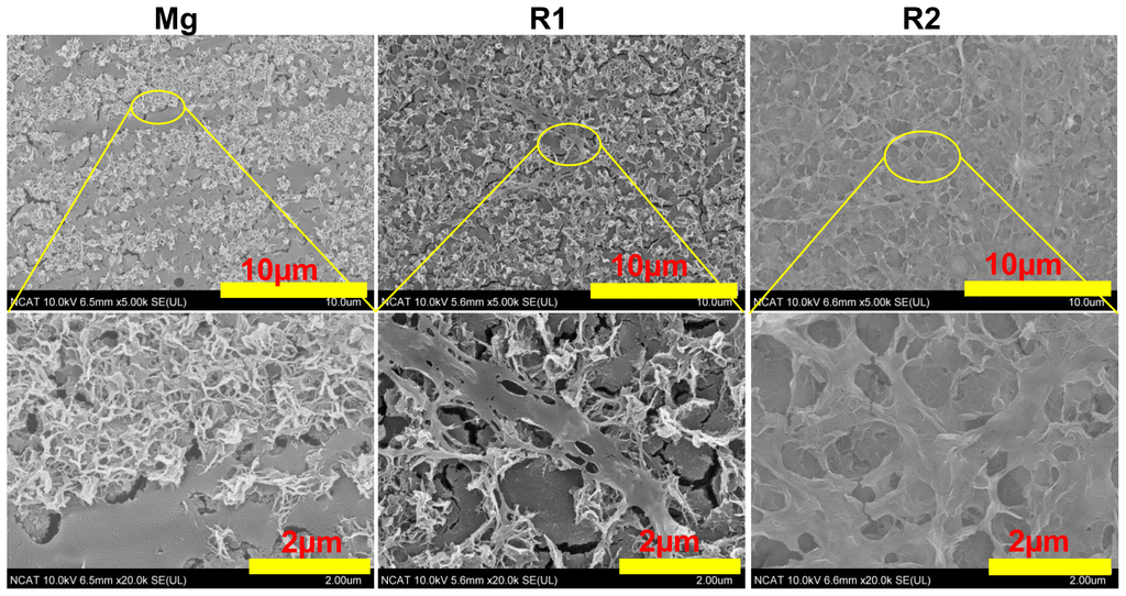 Figure 1 shows the surface morphology of the three materials after coated with collagen. Collagen on pure Mg self-assembled into small fibrils, with lengths less than 2 μm. Most of the small fibrils mingled with others, forming some network structures. On the R1 surface, some long fibers more than 10 μm in length were observed beside the small fibrils. A few of the fibrils intertwined with others forming thicker bundles. In contrast, a collagen sheet mixed with the long collagen fiber covered the entire surface of R2. The different morphology structure may be caused by the different degradation rate of the three materials. The degradation rates for pure Mg, R1 and R2 in static simulated body fluid were measured to be 6.02, 2.26, and 1.50 mm/year, respectively (Table 1). Slower degradation rates could reduce the local concentration of degradation products including Mg and rare earth ions. It was shown that electrolytes such as MgCl2, NaCl, and KCl could affect the process of collagen self-assembly []. But it is unclear how rare earth elements affect the process of collagen self-assembly. It appeared that collagen exhibited better assembly structure on the RE-based alloys, indicating that either the degradation rate in Mg-RE alloys was too slow to affect collagen assembly or RE presence had little impact on collagen self-assembly. The pH value is another factor that might contribute to the different assembly results. The pH value of the assembly environment could determine the electrostatic charge in the collagen monomers. It was believed that at isoelectric point (pI) of pH 9.3, collagen could exhibit optimal assembly results []. However, absorption of ions on collagen molecules could lead to the shift of the pI to a lower pH value, therefore, the optimal condition for collagen assembly is often at pH of 7–8 []. Higher pH and metal ion absorption, resulting from fast degradation in pure Mg, could be the reason why only small collagen fibrils were present. Repulsive forces between collagen molecules on the Mg surface inhibited the assembly of small fibrils into long ones. The microstructures of collagen on R1 and R2 were also different.
