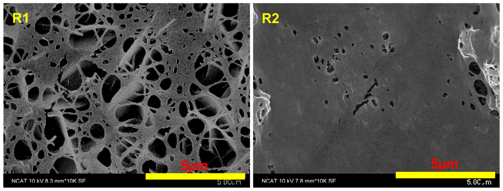 Next, collagen stock solution diluted by R1 and R2 extract solutions was coated on the pure Mg. The morphology of collagen (Figure 2) diluted by R1 and R2 extract solution was much different from that of collagen in DPBS (Figure 1, left panel), indicating that the electrolytes released from the degradation process could affect the assembly of collagen. A layer of collagen sheet with some small cavities was observed in both. R1 has larger and more cavities compared with R2. The formation of hydrogen bubbles during the corrosion process may have caused such a difference, as they prevented collagen absorption onto the surface of Mg materials. The presence of Zn in R2 could reduce hydrogen gas production because zinc ions in solution can compete with Mg ions to form Zn(OH)2, thereby reducing the production of hydrogen gas [].