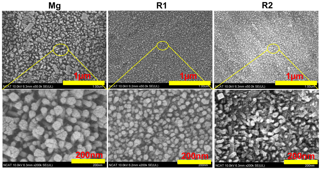 Surface morphology of the three materials after treatment with HF for 3 days was shown in Figure 3. Pure Mg surface was converted into a layer of granular and columnar structure. The diameter of the granules was ~50 nm and the length of the columnar structure was ~200 nm. In both R1 and R2, the granular structures from the converted layers were much smaller than that on the pure Mg surface. Compared to pure Mg, grain size refinement by rare earth elements or direct reactions between rare earth elements with HF may cause such finer porous structures on HF-treated Mg-RE alloys. The addition of Zn in R2 could be the reason for the different alignment of the granular structure. Similarly, Mao et al. showed that Mg-Nd-Zn-Zr alloy, after treatment with HF solution for 12 h, forms a porous layer of MgF2 on its surface []. Also, it was shown that the bonding strength of the interlayer of MgF2 in pure Mg treated with HF was found to be 34 MPa []. Wan et al. also reported a super-hydrophobic porous surface created by 1% HF treatment []. It is believed that the porous structure played an important role in trapping air, which leads to the hydrophobic surface. The porous structure with smaller cavities was observed in Figure 3. MgF2 is insoluble in water and the small cavities among the granular structure were able to trap air. The capability of the HF modified layer to ameliorate Mg degradation is mainly dependent on the size of those granular structures. The smaller cavities on the MgF2 layer, the more efficient they are at trapping air. Another notion, according to a previous study [], is that the MgF2 layer on the material surface might be brittle, thus a modification of the mechanical properties is to be expected. Therefore, one needs to be cautious when applying this HF treatment for balloon expandable stent materials.