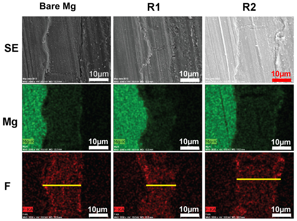 EDS Mapping for cross section of fluoride coating. First row: SEM photos displaying cross sections of magnesium fluoride coating in epoxide resin; Second row: magnesium (Mg, green); Third row: fluorine (F, red). Yellow lines indicate the thickness of fluoride coating (Scale bar: 10 μm).