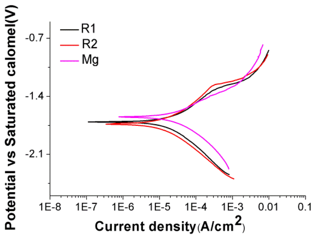 Electrochemical corrosion tests were carried out in Hank’s balanced solution (HBS) at room temperature. DC polarization curves of three bare materials were shown in Figure 5 and corrosion rates for all samples were summarized in Table 1. R2 had the slowest corrosion rate while pure Mg control had the fastest corrosion rate. Pure Mg alloying with rare earth elements reduced the corrosion rate in HBS. The pH value of culture media soaked with all the materials for 3 days was measured. For bare pure Mg the pH rose to 8.70, while HF treated R2 had the lowest pH value of 7.56 after 3 days. Among bare material, HF treated group and collagen treated group, HF treated material showed the least amount of pH change. This result was in good agreement with many previous studies, as supporting HF treatment was an effective way to increase corrosion resistance of Mg-based alloy [,,]. Collagen coating had less effect on preventing Mg degradation so that pH in the collagen coated group was still higher than 8 after 3 days, which is beyond the maximum pH that endothelial cells can tolerate. Also, high pH could lead to fast degradation of collagen fibers, which in turn could interact with magnesium degradation.