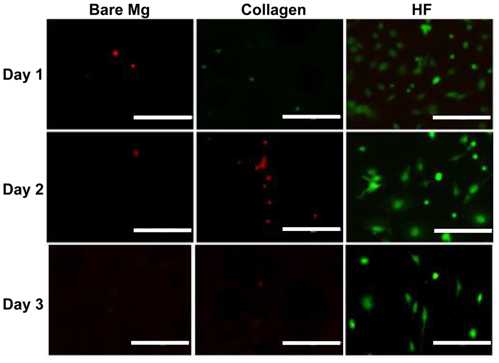 HF treated Mg yielded the most attached and viable cells (green) in all groups. Cell density slightly decreased from the 1st to 3rd day on pure Mg treated with HF. For the non-treated pure Mg control group, some dead cells (red) were still observed on the very first day but none were observed either on day 2 or 3. A few live cells appeared on the surface of collagen coated Mg but the density was much lower than that on Mg treated with HF. In addition, on days 2 and 3 only, dead cells could be seen on the collagen coated group. Collagen coating was used as positive control in this study since it is the most abundant extracellular matrix protein that provides adhesion points for cell attachment and migration. Ao et al. showed that type I collagen covalently combined with titanium enhanced cell-material interactions and improved hMSC attachment, proliferation, and differentiation []. In addition, collagen-coated Ti could promote expression of osteoblast phenotype and enhance bone formation around the implants []. However, on the Mg surface, collagen coating did not show much improvement for HCAECs attachment and proliferation. This is probably due to the different corrosion rate and corrosion mechanism. As the degradation of Mg alloys progressed, increased pH and excess alloying element ions could affect the 3-D structure of biomolecules, leading to the failure of recognition between extracellular matrix proteins and the cell membrane receptors. In addition, hydrogen gas production during the corrosion process could form air bubbles on the Mg surface, which may have prevented both biomacromolecule attachment and cell adhesion.