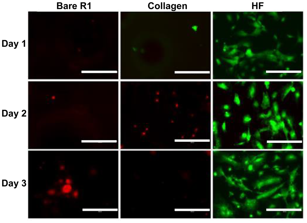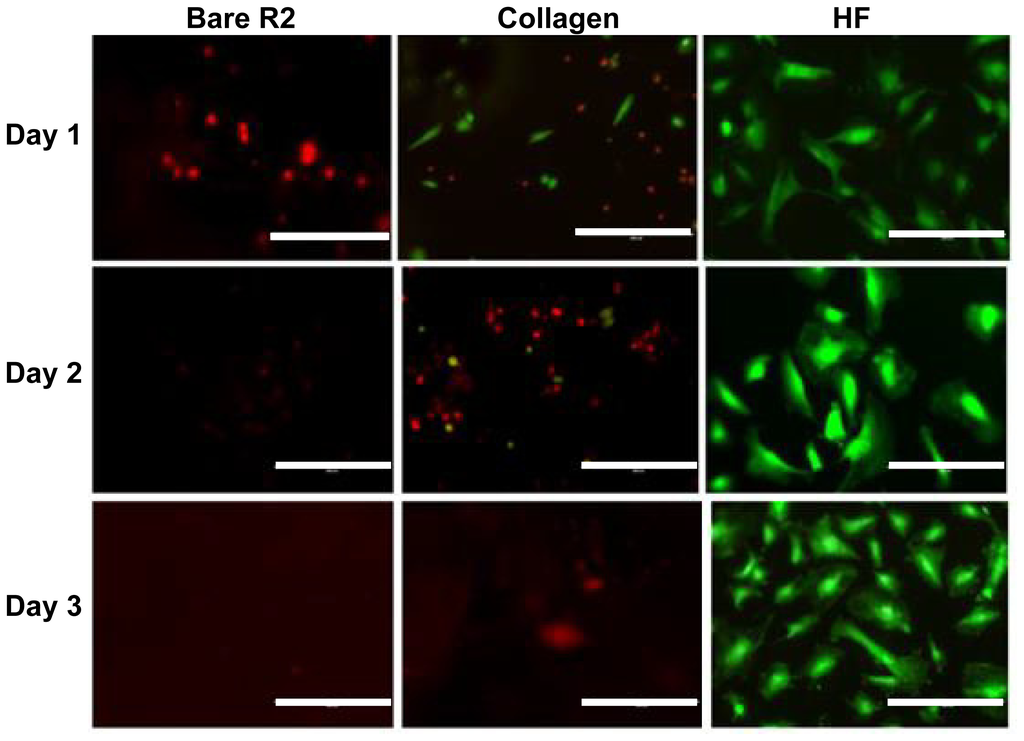 Endothelial cells cultured on bare R2, collagen coated R2 and HF treated R2 alloys from day 1 to day 3. (Scale bar: 10 μm).