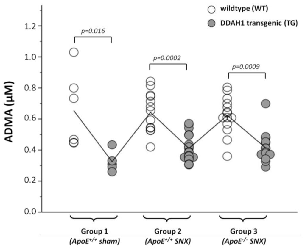 Group 2 (ApoE+/+ mice with SNX, n = 36) was ApoE+/+ SNX male mice with (TG, n = 23) or without (WT, n = 13) overexpression of hDDAH1.