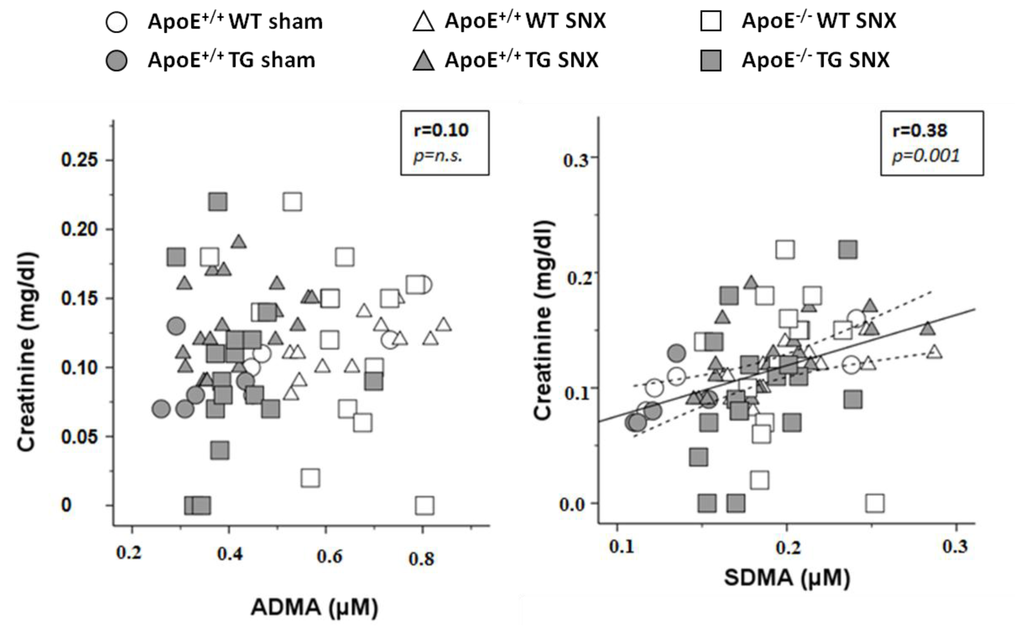 In all of the three treatment groups, mice overexpressing DDAH1 had markedly lower plasma ADMA levels (35%–50% lower versus wild-type (WT) mice; Table 1, Figure 1). Intriguingly, neither SNX nor ApoE-deficiency with SNX was associated with elevated ADMA levels. Thus, within WT and TG mice of different treatment groups, ADMA levels were very similar (Table 1, Figure 1). SDMA levels were only slightly elevated in SNX mice, and the increase was only observed in DDAH1 TG mice that overall had lower SDMA levels than respective WT littermates (Table 1). In WT mice, SDMA levels were similar in sham versus SNX treated mice (Table 1). Plasma l-arginine levels did not differ between treatment groups and genotypes. Accordingly, the l-arginine/ADMA ratio was significantly elevated in mice overexpressing DDAH1. Since SDMA is not metabolized by DDAH enzymes, we observed a significant correlation between serum creatinine levels and SDMA, but not ADMA (Figure 2). As previously shown [14], ADMA levels measured by the use of an ELISA assay were slightly higher compared to those obtained with LC-MS (see Table 1). Overall, there was a robust correlation of ADMA levels detected with either method (r = 0.82, p = 0.0001).