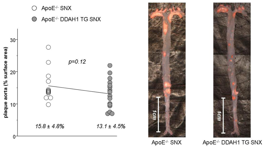 None of the animals of Group 1 or 2 (ApoE-competent mice with or without SNX) developed atherosclerotic lesions within the aorta (data not shown). In ApoE-deficient SNX mice, the degree of plaque formation within the aorta tended to be somewhat lower in DDAH1 overexpressing mice; however, the difference did not reach statistical significance (Figure 3).