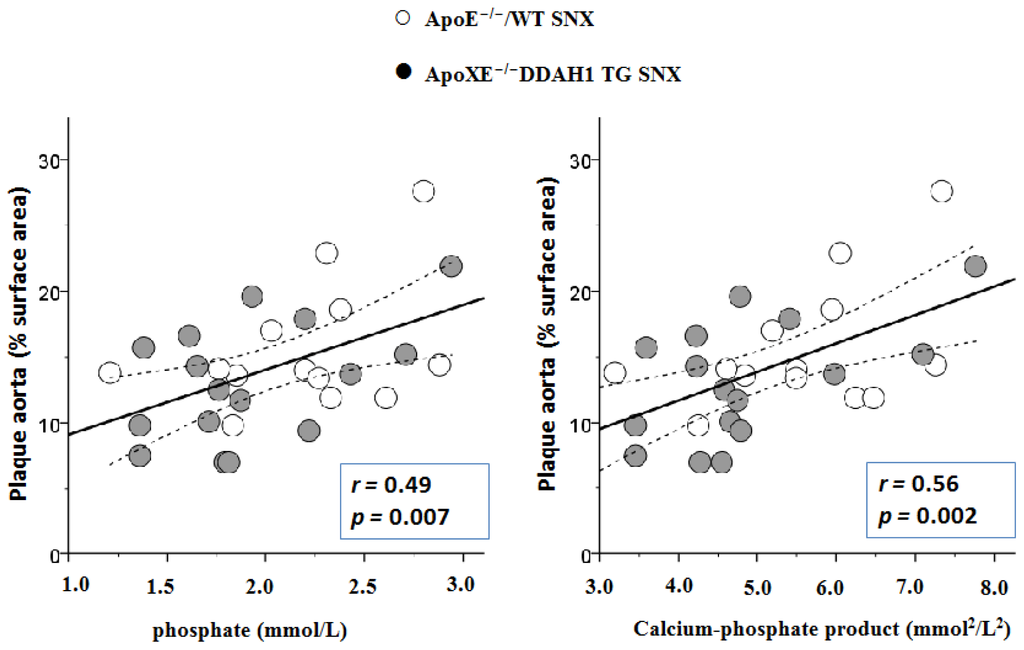 There was a robust correlation between phosphate levels and calcium-phosphate product and atherosclerosis in ApoE-deficient SNX mice (Figure 4).