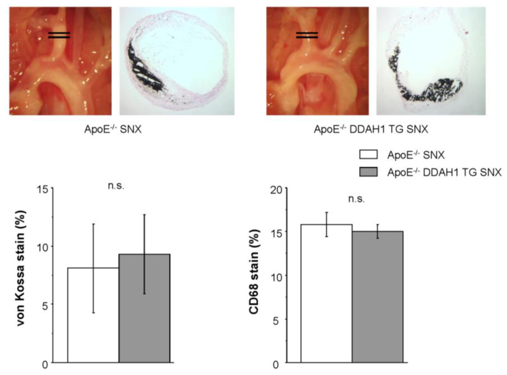 In conclusion, plasma levels of ADMA are unaltered in our SNX model of CKD in mice. In addition, overexpression of the ADMA degrading enzyme, DDAH1, in SNX treated ApoE-deficient mice does not ameliorate atherosclerosis. Our data clearly do not support the notion that ADMA plays a particularly important role for atherosclerosis in CKD.