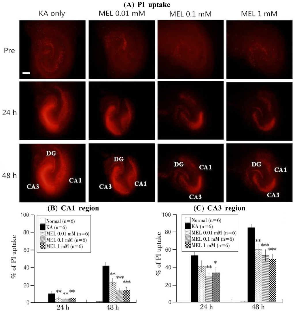 To observe neuronal cell death, we used propidium iodide (PI, Sigma, St. Louis, MO, USA) staining. Three weeks after OHSCs, cultured normal hippocampal slices were added with 5 μM PI in culture medium and detected the neuronal death in the pre-phase which has no PI uptake in the hippocampal layers. After KA treatment for 18 h, degenerated tissue was removed from the membrane insert and PI uptake was monitored. Effects of 0.01, 0.1, and 1 mM melatonin treatment for 24 and 48 h were observed by PI. Full kill was performed with 10 mM NMDA (Sigma) to produce neuronal death in all tissue areas. Finally, pre, 24 h, 48 h, and full-kill phase results were detected by the fluorescence microscope and analyzed with a MetaMorph program (Universal Imaging, Downingtown, PA, USA). All values of the fluorescence were calculated using the following formula: % of PI uptake = (Ft − Fpre)/ (Ffk − Fpre) × 100 (Ft = PI uptake at 24 or 48 h after melatonin treatment, Fpre = pre, Ffk = full kill).