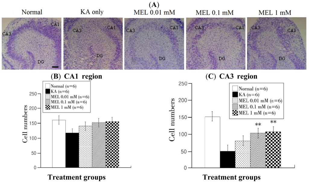 It has been previously shown that KA generates ROS in the brain [20,21]. Recently, some studies have demonstrated that melatonin may attenuate brain injury through its antioxidant effect. According to Juliana et al. [22], amyloid-β neurotoxicity was reduced by melatonin in organotypic culture. It has also been shown that the administration of melatonin in rats attenuates oxidative stress-induced neurodegeneration and microglial generation [23]. Especially, Zaja-Milatovic et al. [20] have noticed that MT1A and MT1B receptors are abundant in the CA1 and CA3 region of the hippocampus which regulates the activation of melatonin.