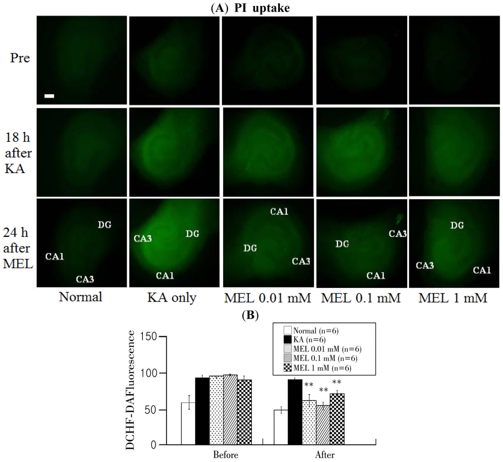 Relationship between melatonin treatment and ROS formation. (A) DCFH-DA intensities in each group. DCFH-DA expression level was detected at pre, 18 h after KA injury, and 24 h after melatonin treated phase; (B) Quantification of DCFH-DA intensities using a MetaMorph program. The horizontal axis indicates pre-melatonin treatment (Before) and 24 h after melatonin treatment (After) and the vertical axis represents DCFH-DA intensity in the hippocampal tissues. Data are mean ± SEM (n = 6). ** p < 0.01: one-way ANOVA followed by LSD for comparison with each group. Scale bar: 500 μm.