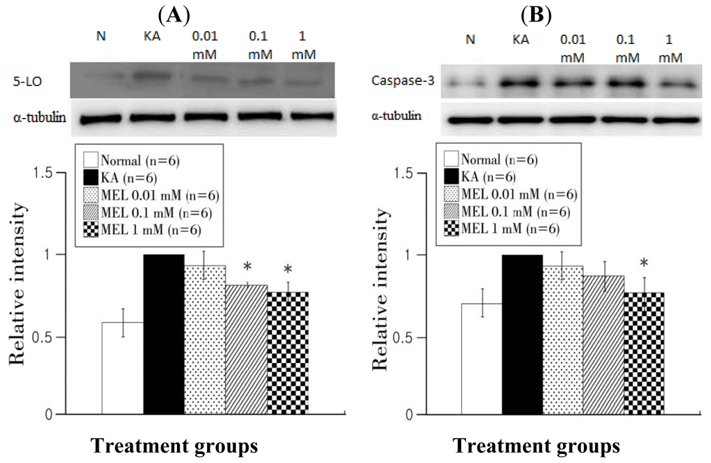 Western blot analysis of 5-LO and caspase-3 in OHSC after melatonin treatment following KA. (A) The expression of 5-LO at 24 h after the 0.1 and 1 mM melatonin-treated groups was significantly lower than that of the KA-treated group; (B) The level of caspase-3 at 24 h after melatonin treatment. The 1 mM melatonin-treated group showed lower caspase-3 expression than KA group. The horizontal axis indicates each experimental group (Normal, KA, 0.01, 0.1, 1 mM) and the vertical axis represents the level of protein expression ratio (antibody expression/α-tubulin expression). Data are mean ± SEM. * p < 0.05: one-way ANOVA followed by an LSD test.