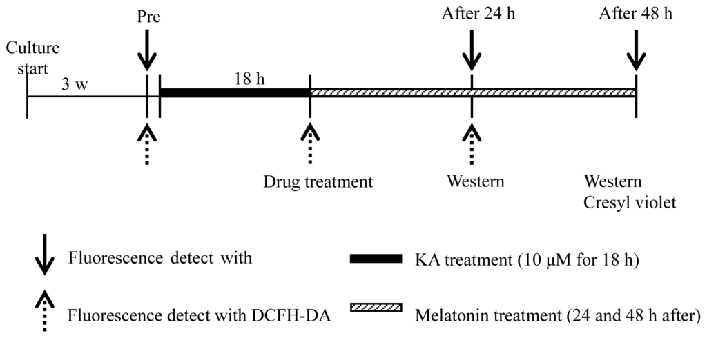 Diagram of the experimental procedure. OHSCs was cultured for three weeks and 5 μg/mL PI was treated in the culture medium (pre-phase, Pre). After 1 h, the pictures of pre-phase cultured hippocampus were taken. Then, 10 μM DCFH-DA was treated for 30 min and DCFH-DA picture was taken. KA was diluted and treated with fresh culture medium for 18 h. DCFH-DA pictures were taken in this phase but not PI uptake. Subsequently, melatonin-treated hippocampus pictures of 24 and 48 h after melatonin treatment for PI and 24 h DCFH-DA were gathered.