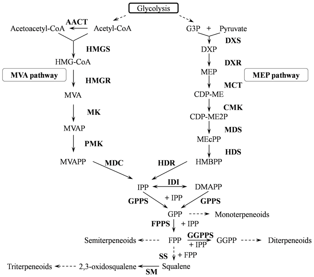 - Laule, O.; Furholz, A.; Chang, H.S.; Zhu, T.; Wang, X.; Heifetz, P.B.; Gruissem, W.; Lange, M. Crosstalk between cytosolic and plastidial pathways of isoprenoid biosynthesis inArabidopsis thaliana. Proc. Natl. Acad. Sci. USA 2003, 100, 6866–6871. [Google Scholar]