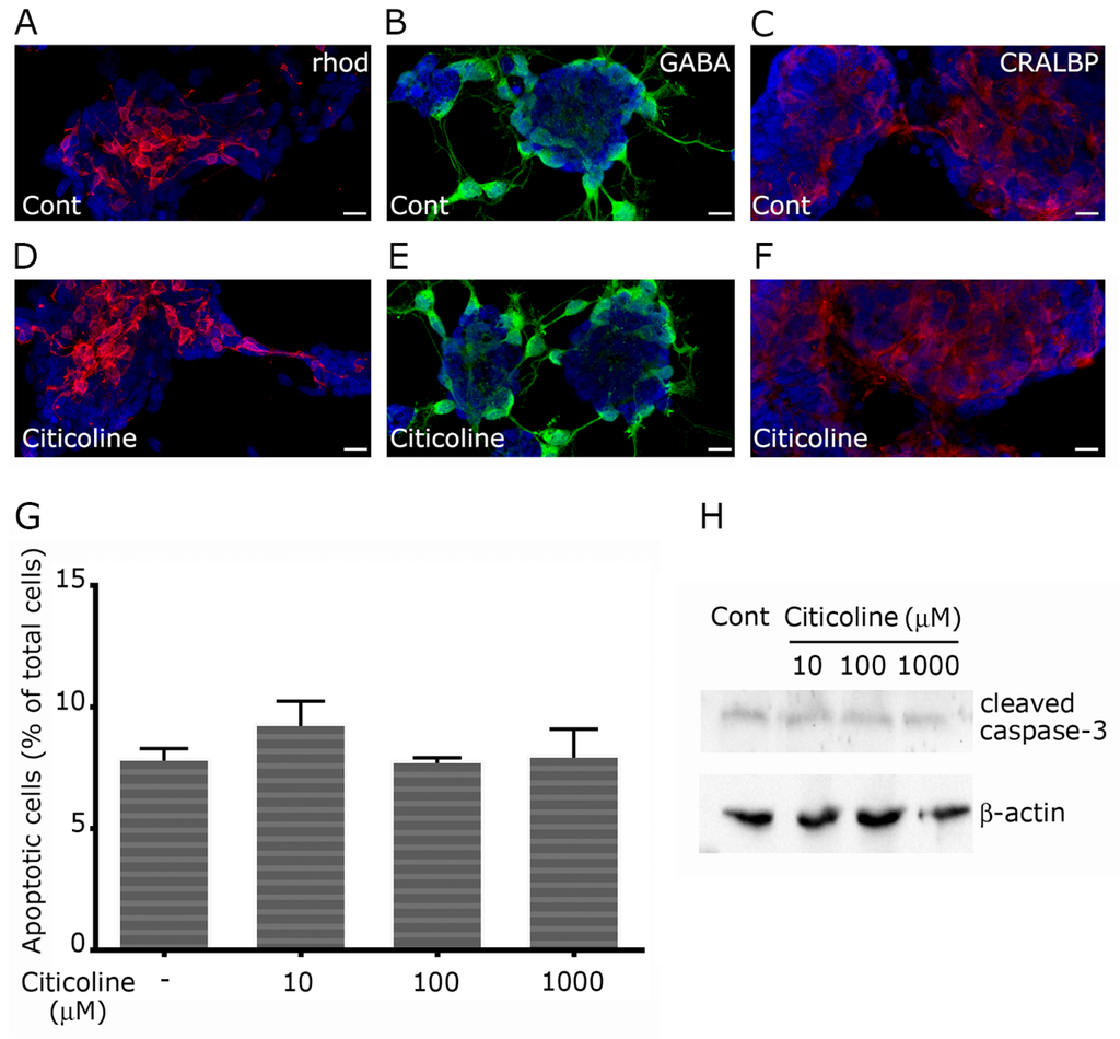 Citicoline treatment does not induce cytotoxic effect in primary retinal cultures. Primary retinal cultures, treated or not with 100 μM citicoline for 96 h, were immunolabeled with antibodies against rhodopsin (A,D rhod), GABA (B,E) and CRALBP (C,F), in order to evidence photoreceptors, GABAergic neurons and Müller glia, respectively. Cell nuclei were counterstained with Hoechst 33258. Antibody immunoreactivity was unaffected in citicoline-treated samples, showing that the agent does not influence cell composition and differentiation in primary retinal cultures (D–F); Apoptosis was evaluated by TUNEL assay. Apoptotic nuclei were quantified as percentage of TUNEL-positive nuclei over total nuclei. Bars represent the mean ± SEM of at least five independent experiments (G); Absence of proapoptotic effects after citicoline treatment is also shown by unchanged levels of activated cleaved caspase 3 (H). Whole cell lysates were prepared from primary retinal cultures. Equal amounts of total protein from each lysate were resolved on 15% SDS-PAGE and transferred to nitrocellulose membranes. Membranes were probed with anti-cleaved caspase 3. β-actin levels were used as control of protein loading. Blots are representative of three independent experiments. Bars = 20 μm.