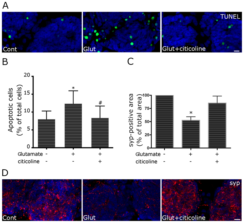 Citicoline treatment protects retinal cells against glutamate-induced apoptosis and synaptotoxicity. To evaluate protective ability of citicoline against excitotoxicity, primary retinal cultures were treated with 100 μM citicoline 24 h before excitotoxic insult, induced with exposition to 100 μM glutamate for 25 min. The medium was then replaced with fresh Minimum Essential Medium/10% Fetal Calf Serum (MEM/FCS) and the cells were fixed after 24 h. Apoptosis was evaluated by TUNEL assay (A,B); Synapses were evidenced by immunolabeling of synaptophysin (C,D). In glutamate-treated retinal cultures, the increase in apoptotic nuclei (green) is counteracted by citicoline treatment (A); TUNEL-positive nuclei were counted and apoptosis was expressed as percentage of apoptotic cells over total cells. Bars represent the mean ± SEM of at least five independent experiments (B); Citicoline treatment significantly reduces the apoptotic rate in glutamate-treated cells. * p < 0.05 vs. control; # p < 0.05 vs. glutamate-treated cells, Wilcoxon matched pairs test. For morphometric analysis of synaptophysin immunostaining, at least eight fields were captured for each culture. The density of synaptic puncta was measured as synaptophysin-positive area in each selected field, applying the same threshold parameters to all images. Values were pooled to obtain a single mean value for each condition. Significantly lower positivity for synaptophysin is observed after glutamate treatment. The decrease is reversed in the presence of citicoline (C). * p < 0.05, Mann-Whitney U test. In (D), representative images are shown (syp, red). Bars = 20 μm.
