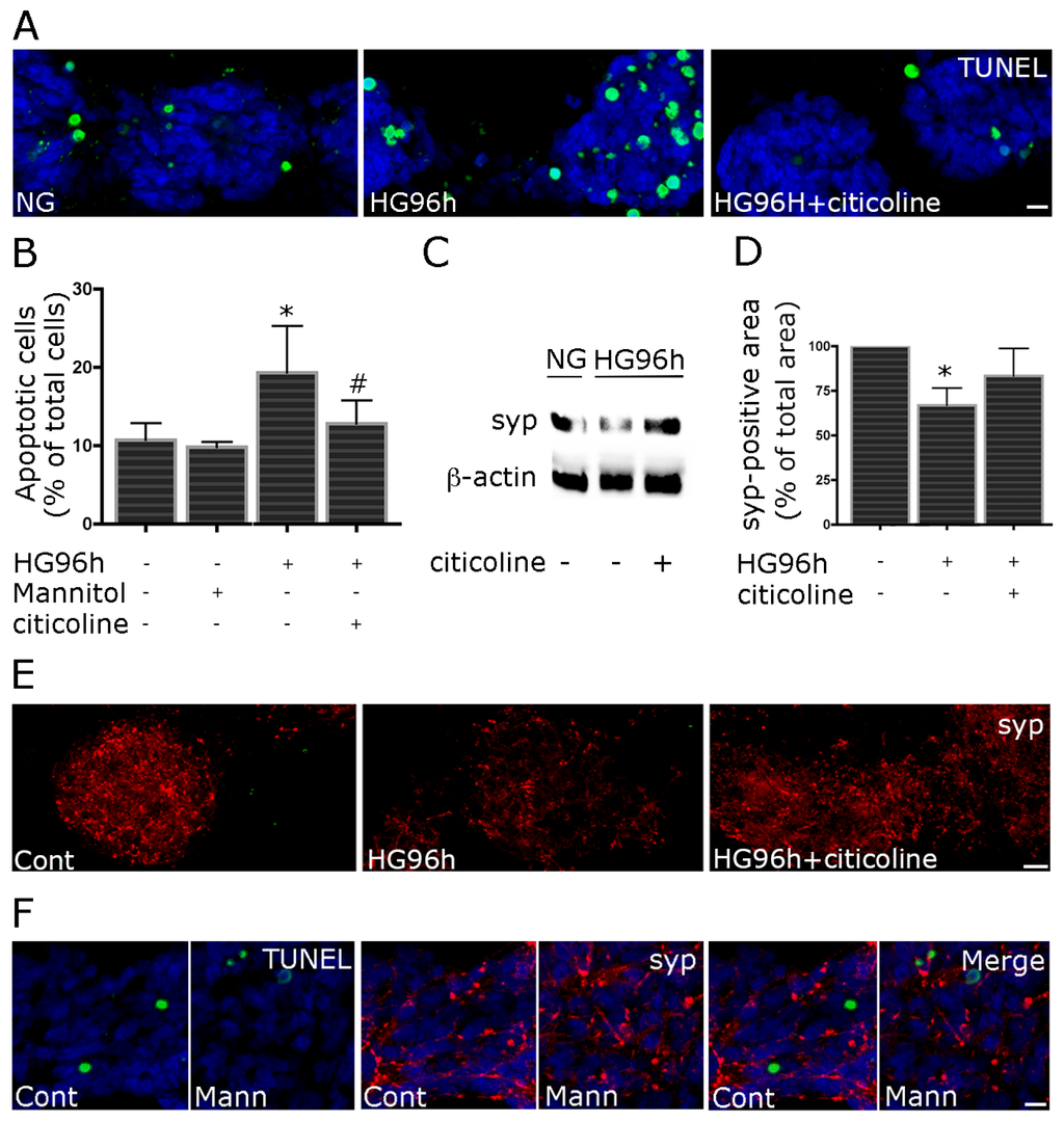 A neuroprotective effect was also detected against HG-induced neurotoxic damage. Primary retinal cell cultures, exposed to daily changes of HG for 96 h, showed a moderate increase in apoptosis, which was reversed in the presence of 100 μM citicoline (Figure 3A,B). Moreover, after the treatment with HG for 96 h, we observed a neurotoxic effect in terms of decrease in synaptophysin expression. Both WB and morphometric analyses showed a reduction in synaptophysin levels. Again in the presence of citicoline, synaptophysin levels were similar to control cultures (Figure 3C–E). Treatment with iso-osmolar mannitol did not induce increase in apoptosis (Figure 3B,F) or decrease in synaptophysin immunolabeling (Figure 3F).