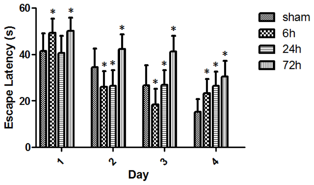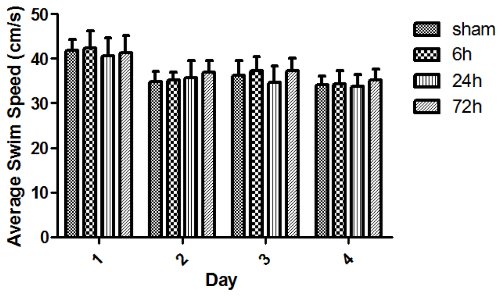 - Morris, R. Developments of a water-maze procedure for studying spatial learning in the rat. J. Neurosci. Methods 1984, 11, 47–60. [Google Scholar]