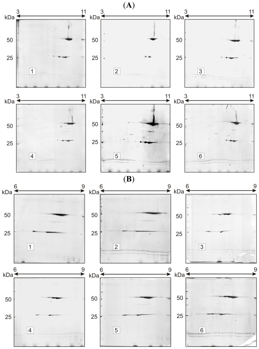 - Görg, A.; Postel, W.; Günther, S. The current state of two-dimensional electrophoresis with immobilized pH gradients. Electrophoresis 1988, 9, 531–546. [Google Scholar]