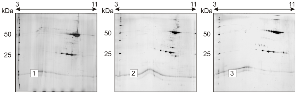 - Rabilloud, T.; Valette, C.; Lawrence, J.J. Sample application by in-gel rehydration improves the resolution of two-dimensional electrophoresis with immobilized pH gradients in the first dimension. Electrophoresis 1994, 15, 1552–1558. [Google Scholar]