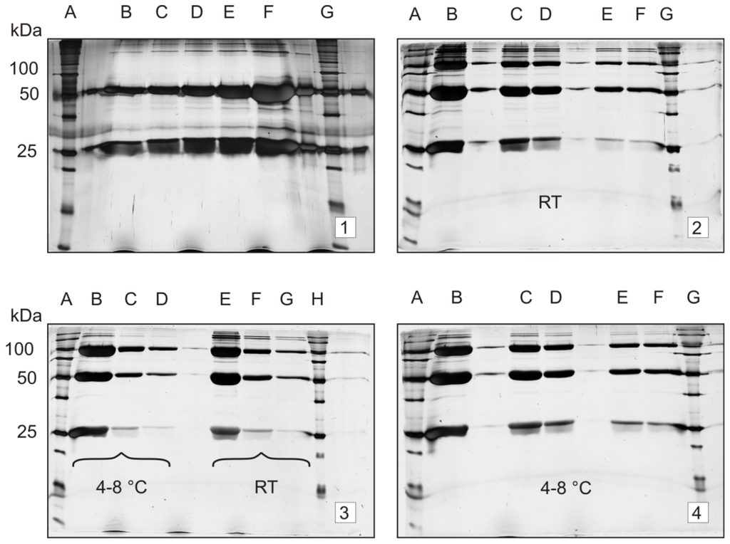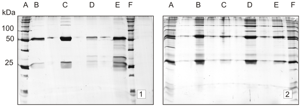 - Laemmli, U.K. Cleavage of structural proteins during the assembly of the head of bacteriophage. Nature 1970, 227, 680–685. [Google Scholar]