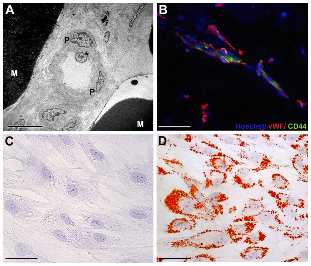 Human adipose-derived stem cells: origin, morphology and differentiation potential. (A) Transmission electron microscopy image of human adipose tissue, with large accumulation of electron dense intracellular lipid in mature adipocytes (M), and perivascular cells featuring ASCs (P) surrounding a small blood vessel with a prominent endothelial cell (*). Scale bar, 10 μm; (B) Merged double immunofluorescence of a cryostatic section of human adipose tissue showing CD44 positive ASCs (green) around von Willebrand factor (vWF, red) positive endothelial cells of a small vessel. Nuclei are stained with Hoechst (blue). Scale bar, 100 μm; Contrast phase images of Oil Red O negative staining (C) of serum-cultured ASCs and (D) strongly positive ASCs after combined platelet-derived growth factors plus insulin treatment showing abundant intracytoplasmic lipid droplets. Scale bar, 100 μm.