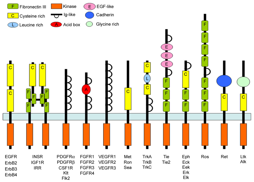Receptor tyrosine kinase family. Schematic representation of receptor tyrosine kinase family involved in the regulation of biological properties and differentiation of ASCs.