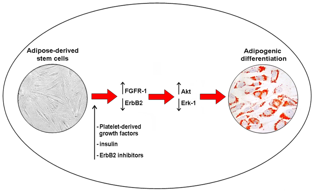 The present review outlines the biomolecular process regulating the adipogenic differentiation of ASCs, that involves RTKs, in particular FGFRs and ErbB receptors, and their downstream effector Akt. Recent studies support the hypothesis that biomolecular pathways regulating adipogenic and vasculogenic differentiation of ASCs are similar and both regulated by complex receptor-mediated pathways. Further studies are needed to provide more information about the regulatory mechanisms involved in the specific differentiative lineages of ASCs, in order to obtain suitable therapeutic instruments for new and safe technologies in the field of reconstructive surgery.