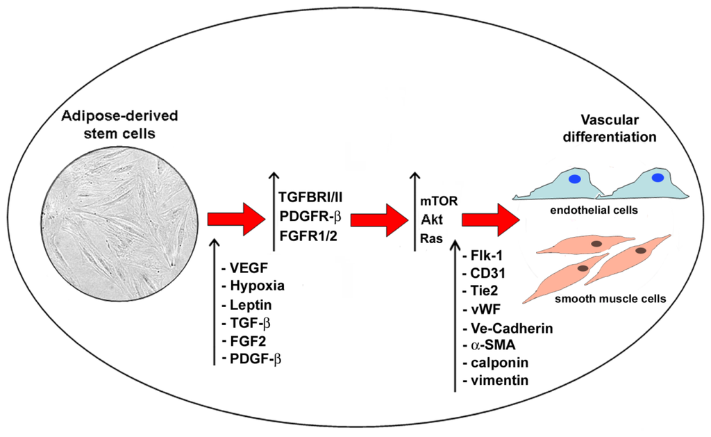Vascular differentiation of ASCs. Schematic representation of vascular differentiation of ASCs. In particular, under different stimuli (VEGF, leptin, hypoxia, TGF-b, FGF2, PDGF-β), ASC receptor signaling (TGFBRI/II, FGFR1/2, PDGFR-β) is activated and downstream targets upregulated in order to induce vascular differentiation.