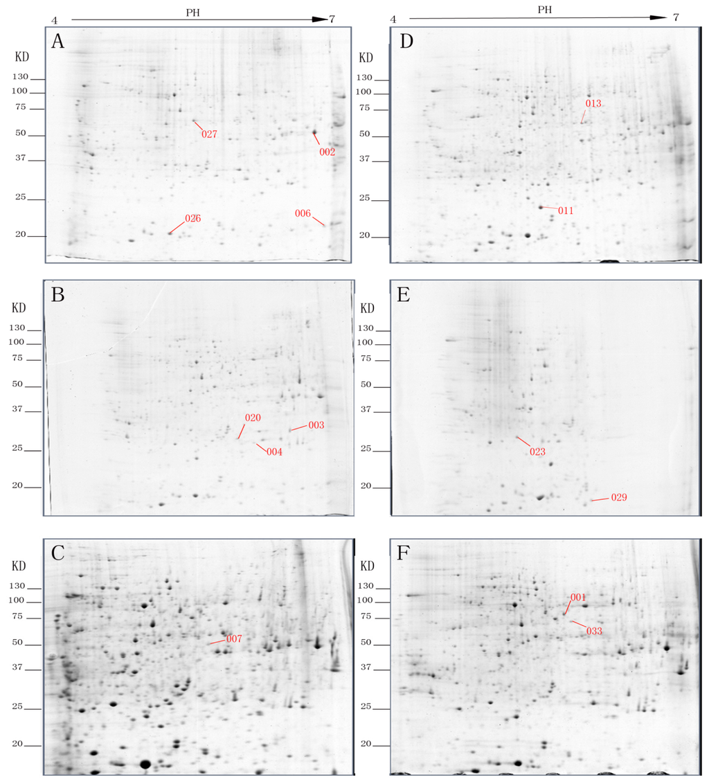 Representative two-dimensional electrophoresis (2-DE) gels of rooting of etiolated juvenile tetraploid Robinia pseudoacacia branches after (A) day 0; (B) day 3; and (C) day 9. Representative 2-DE gels of rooting of non-etiolated juvenile tetraploid Robinia pseudoacacia branches after (D) day 0; (E) day 3; and (F) day 9.