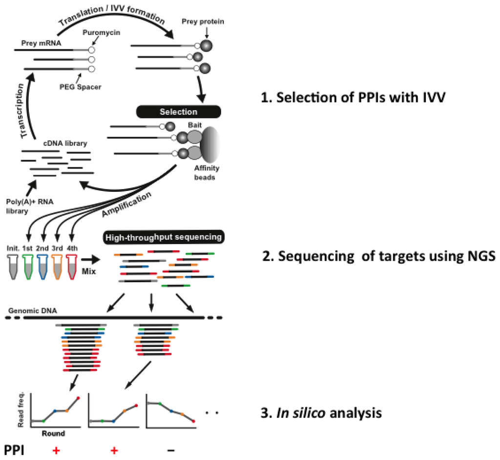 We have developed an in vitro virus (IVV) system [5,6] as a PPI analysis tool. IVV involves covalent binding of an mRNA molecule and the protein encoded by the mRNA through puromycin. The IVV is synthesized from cDNA using a cell-free translation system, thus avoiding the issue of biological toxicity happens in cells. This method allows the acquisition of more data compared with cell-based experimental systems and can compensate for the disadvantages of AP-MS and Y2H, thus providing complementary PPI data.