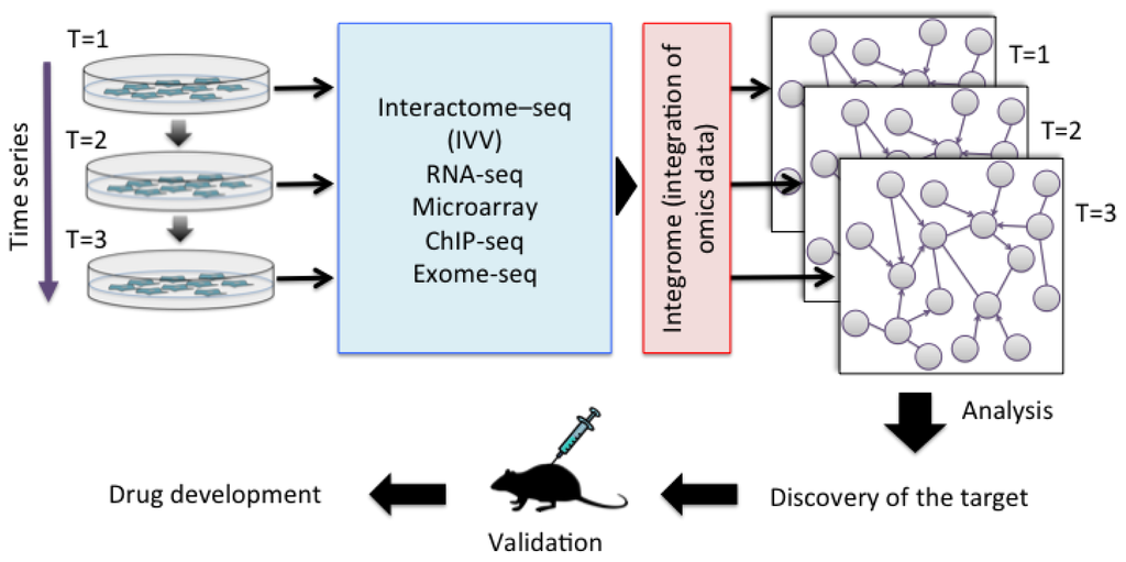 The dynamics of the pharmacological response mechanisms can be examined by analyzing the integrated multi-omics data. First, the time series of interactome–seq (IVV), RNA-seq, microarray, ChIP-seq and exome-seq are integrated. Second, an efficient module-detecting algorithm is applied to the composite maps. The maps can then be used to compare cancer cells and normal cells, and to assess the effects of medicines. Finally, the identified targets can be validated in animal experiments for subsequent drug development.