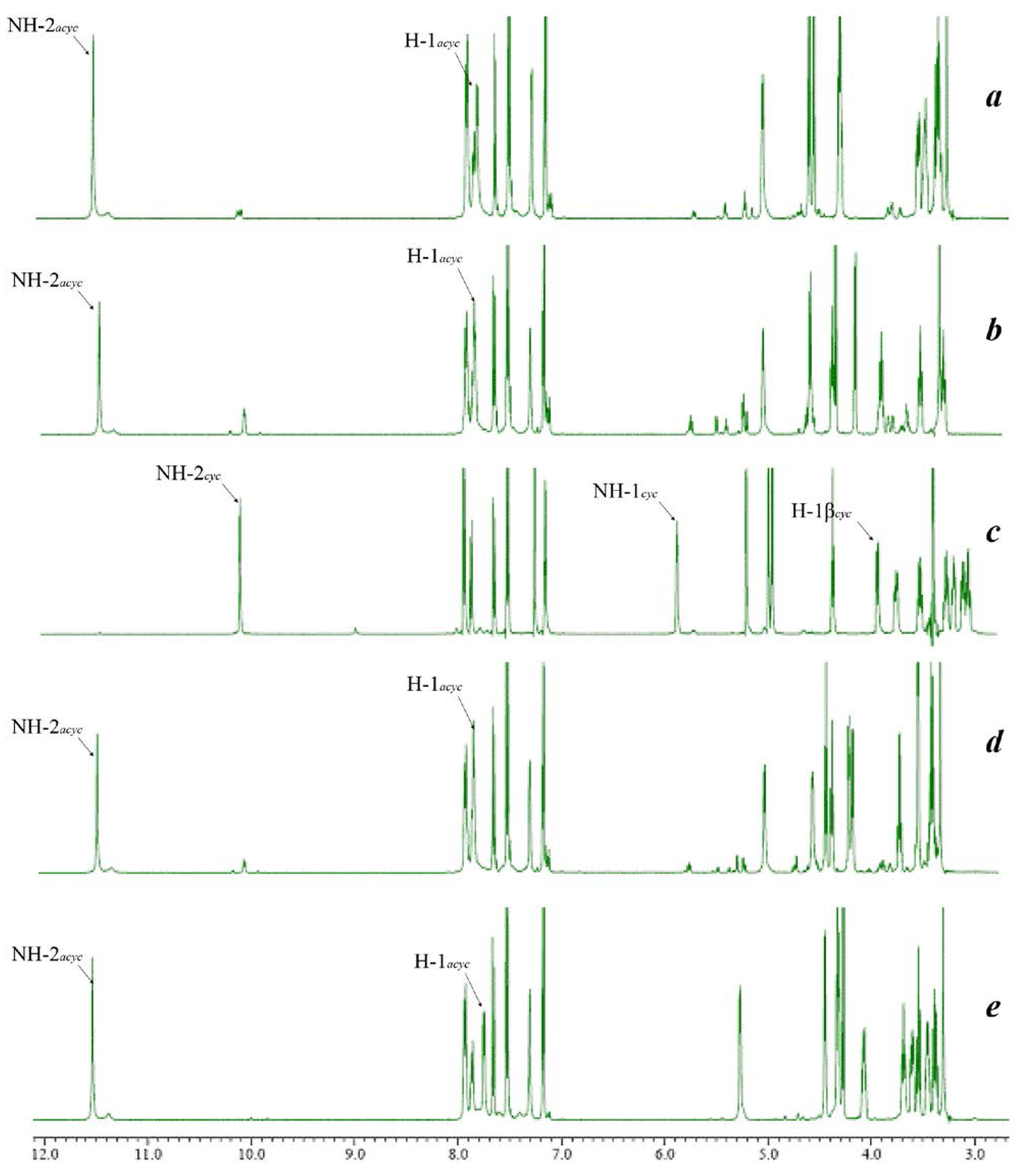 500 MHz 1H NMR spectra of condensation products of 5-(4′-chlorophenyl)-2-furoyl hydrazide with different monosaccharides: d-arabinose (a); d-fucose (b); d-glucose (c); d-galctose (d); and d-mannose (e) in DMSO-d6 solution.